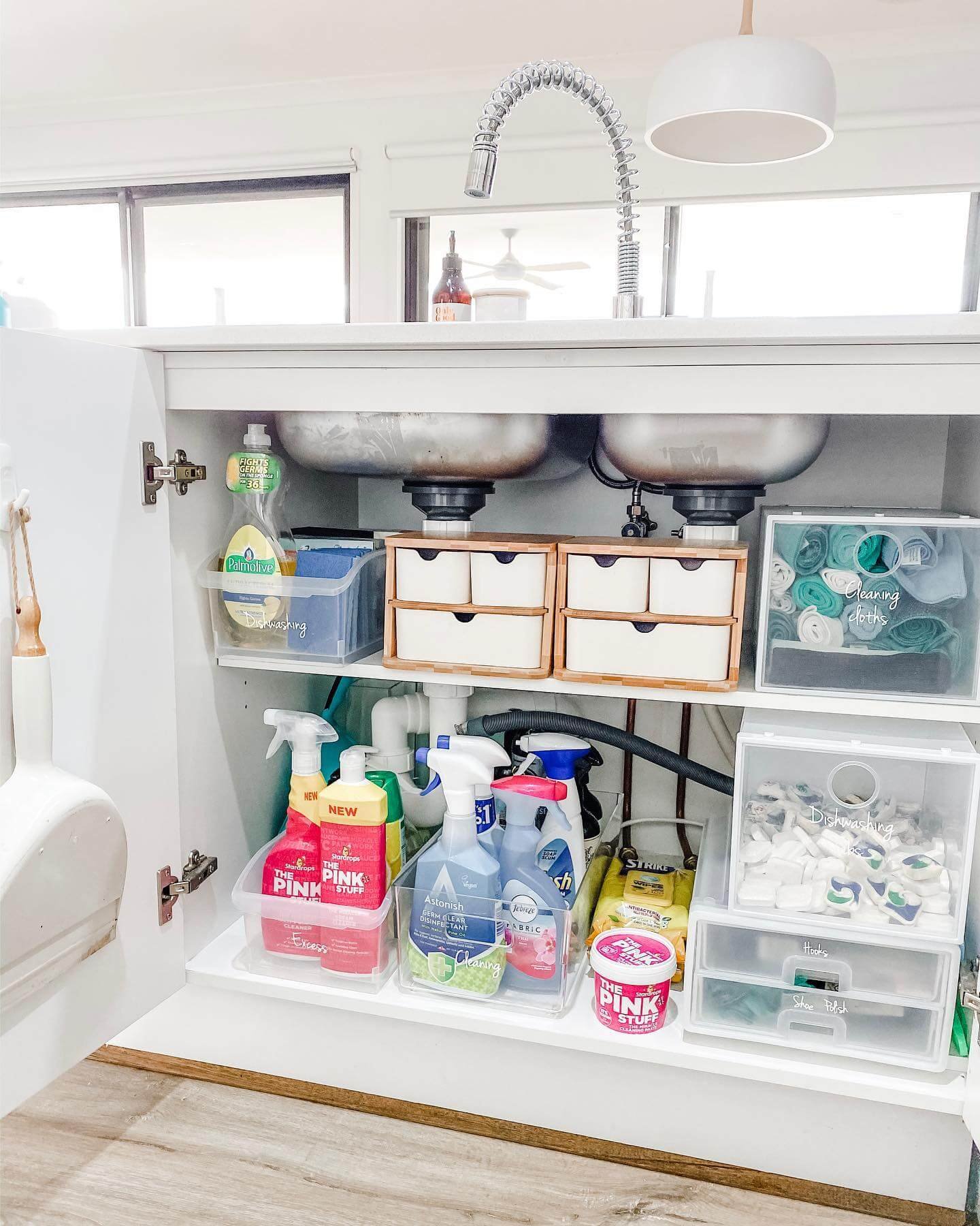- Under-sink area: Use clear bins to organize and prevent forgotten items from accumulating in the back.