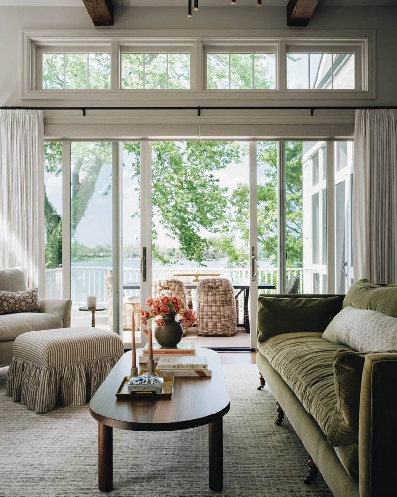 A tasteful coffee table, adorned with books and a simple vase of flowers, keeps the space functional yet stylish. Consider incorporating similar elements in your own home for that cozy, lakeside feel.